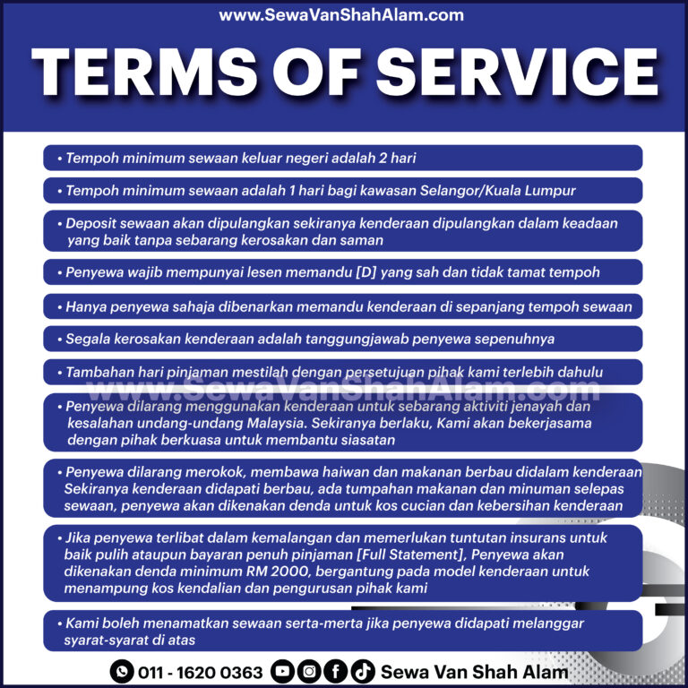 SEWA VAN SHAH ALAM | KLANG Kami Menyediakan Perkhidmatan Sewa Van Hiace Full Window & Full Panel 011-1620 0363 VAN Kami menyediakan perkhidmatan sewa Van Full Panel dan Van 12 Seater Full Window untuk perjalanan jauh Sewa Urusan boleh dibuat melalui WhatsApp. Van tersedia untuk anda SEWA VAN SHAH ALAM Toyota Hiace Van 2.5 Turbo Diesel Manual | Self Driving 12 Seater 1 Day RM 400 / HARI More than 3 Days RM 370 / HARI More than 7 Days RM 330 / HARI Panel Van 1 Day RM 370 / HARI More than 5 Days RM 330 / HARI More than 10 Days RM 300 / HARI * Tiada Sewaan Separuh Hari dan Jam BOOKING RM 300 YA, SAYA BERMINAT Kami Sedia Membantu Anda Jom Klik Sewa Van Shah Alam Facebook Tiktok Instagram Youtube PELANGGAN KAMI LOKASI SEWA VAN SHAH ALAM Tel: 011-1620 0363Email: SewaVanShahAlam@gmail.comIsnin - Sabtu 8.30 a.m - 6.00 p.mOffice: 76 Jalan Setia Utama AS U13/AS Setia Alam Seksyen U13, Setia Alam, 40170 Shah Alam, Selangor ( SA0601280-D2 )